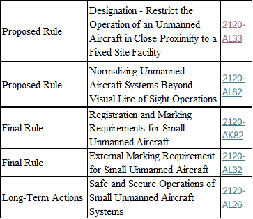 The table below shows the five rulemakings listed for the Federal Aviation Administration pertaining to uncrewed aircraft systems.